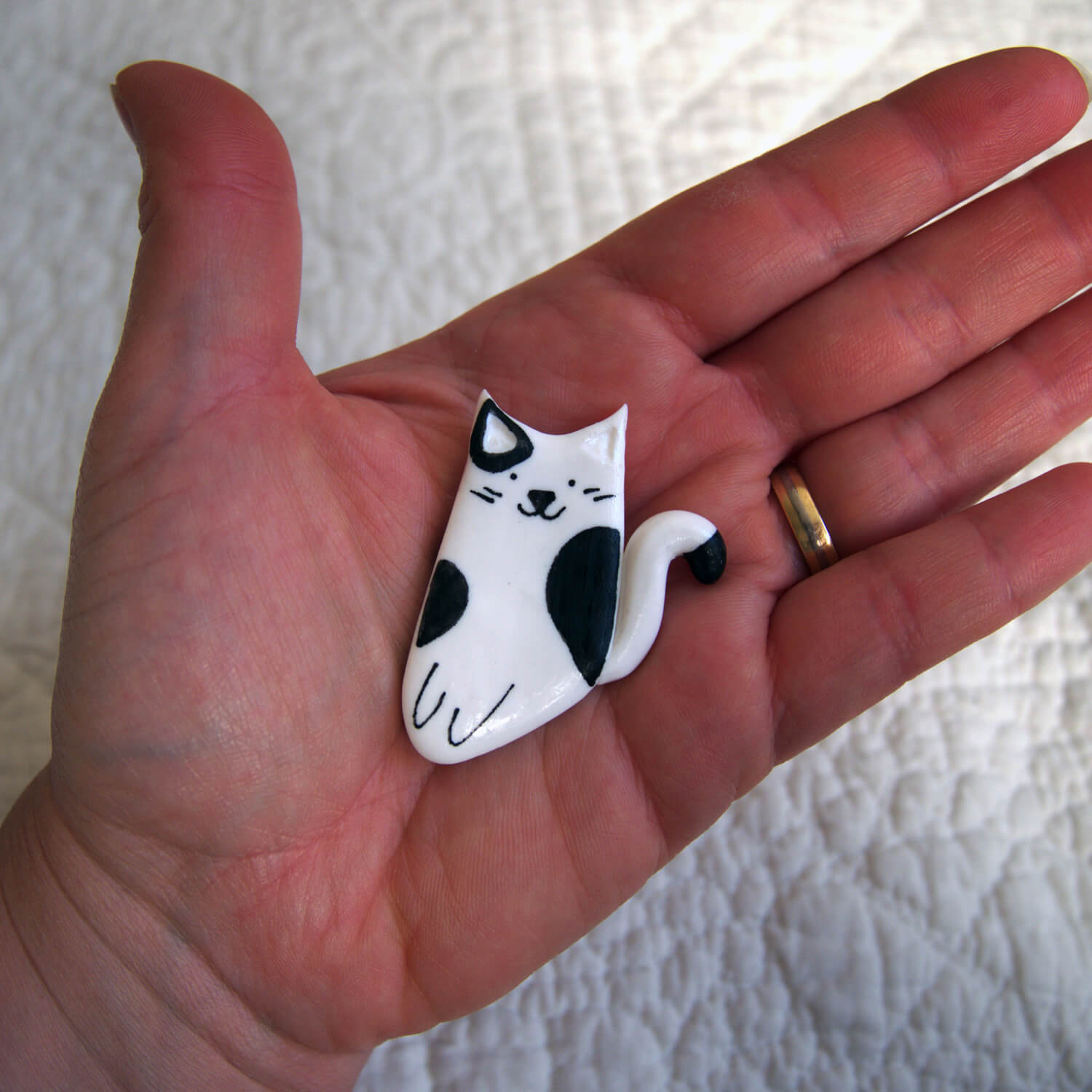 – Broche en argile polymère couleur blanc modelée et décorée à la main en noir ;